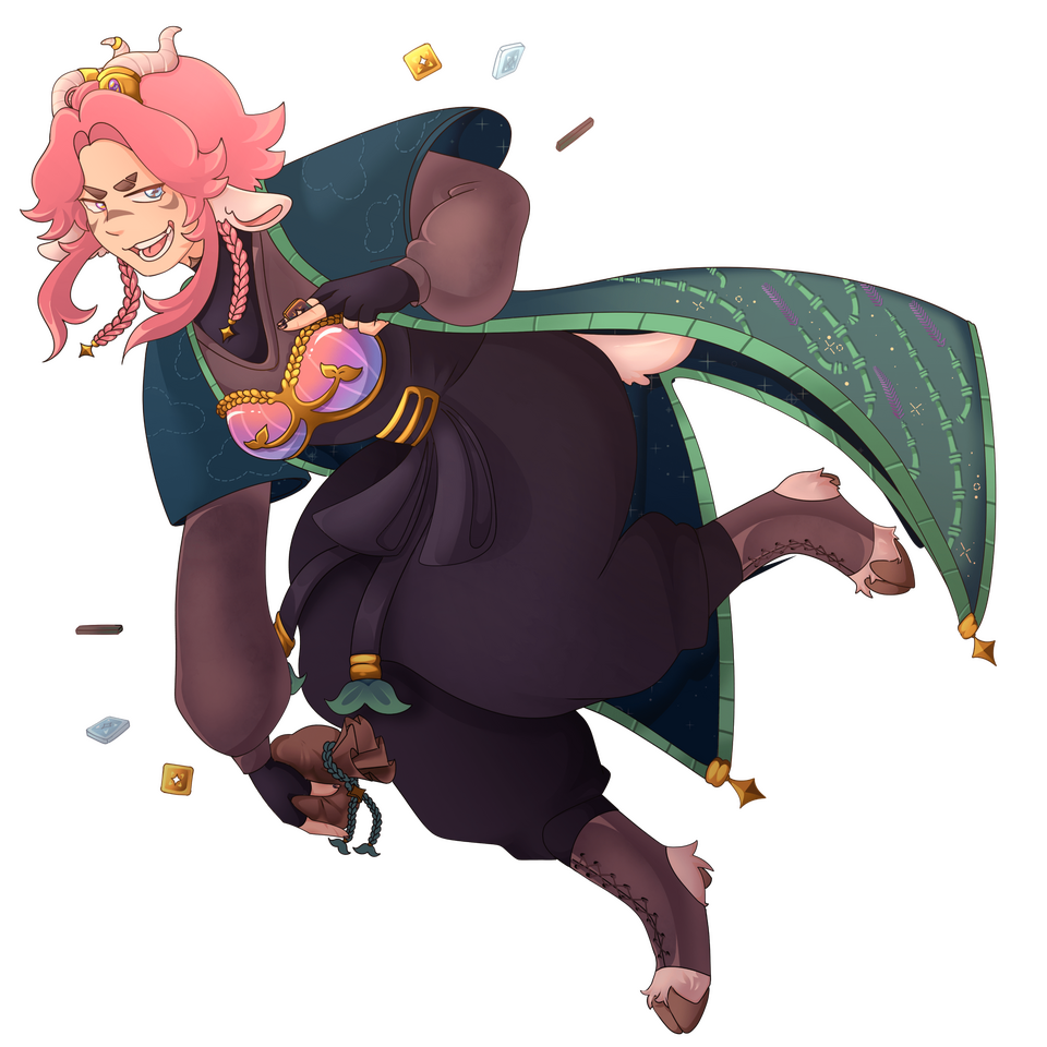 Moss Petrichor is a traveling merchant goat lady who wanders around the land of Cluster.Cluster's inhabitants vary and spread diverse from humans to beast-like creatures to robots and much more. Technology and magic fuse together to form a brighter future for everyone...After all, the Wildlands, connecting the different cities, villages, and regions together, are inhabited by monsters and beasts that run feral and act on their natural instincts. However, nature also spreads across the fields as old ruins lay to be discovered, adventures to be held, and land to cover.During the old ages when magical technology slowly started to have its uprising and steam power was still number one, not many people could keep themselves safe from the monsters that wait to hunt their prey and slay the weak.With that "The Elite" were formed to keep the people of Cluster safe. From generation to generation, The Elite were chosen members who were the best in what they did.Fighting, creating, mending.
